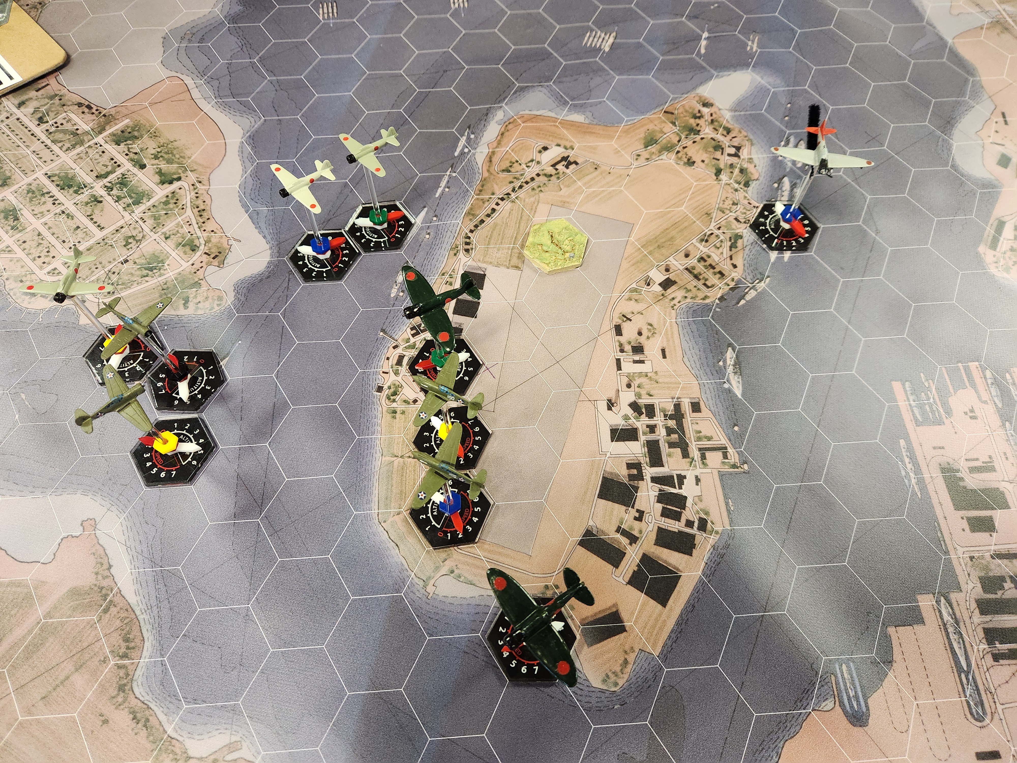 Last weekend I hosted a Check Your 6! event at the local shop. Using the Pearl Harbor Second Strike scenario, slightly modified to accommodate the number of players, we were able to recreate the scenario using the custom Pearl Harbor mat from Deep Cut Studio. We cut the Japanese by three Zeros, reduce the American anti-aircraft by half, and remove one P-40 and one P-36, trying to balance the game for five players.